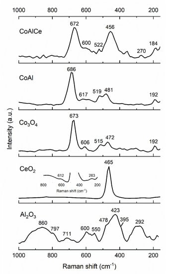 The spectra of the Co3O4 show five main peaks at 673, 606, 515, 472 and 192 cm−1. The peak at 673 cm−1 with A1g symmetry can be attributed to the octahedral sites CoO6 (Co3+), whereas the peaks at 192 cm−1 correspond to the tetrahedral sites CoO4 (Co2+) with the F2g symmetry mode [,,,]. The bands at 606 cm−1 and 515 cm−1 can be attributed to the Fg2 symmetry mode and the peak at 472 cm−1 corresponds to the Eg mode [,,,]. The spectrum of the CeO2 was associated with one intense peak at 465 cm−1, which can be assigned to the symmetric O–Ce–O stretching mode of CeO2 [,,]. In addition, two weak bands can be found at around 263 cm−1 and 612 cm−1. These weak bands may be due to disturbances in the fluorite-structure of lattice [].