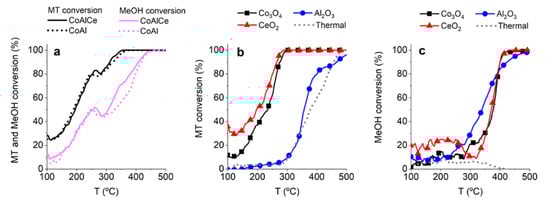 The results of the light-off tests are presented in Figure 6. Overall, MT reacted at lower temperature than MeOH over all the samples except alumina. The MT conversion was nearly 100% at 350 °C over the CoAlCe catalysts and 365 °C over the CoAl catalyst. The MeOH conversion was nearly 100% at 455 °C with both the mixed oxide catalysts. Of the single oxides, Co3O4 and CeO2 showed higher activity than alumina. The complete MT and MeOH conversions were reached at similar temperatures, 290 °C and 425 °C, respectively. Both methanethiol and methanol were converted at lower temperatures over Co3O4 and CeO2 single oxides compared to the mixed oxide catalysts. The activity of Al2O3 based on the MT conversion was significantly lower than that of CeO2 and Co3O4 and somewhat lower in the case of methanol. It is noteworthy that there are no significant differences in the MT conversions in the catalytic reaction over alumina and in the thermal oxidation. Instead, the methanol conversion was very low in the thermal oxidation. It seems evident that alumina is responsible of lower activity of the mixed oxides compared to the single oxide CeO2 and Co3O4.
