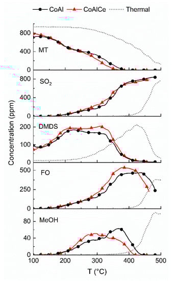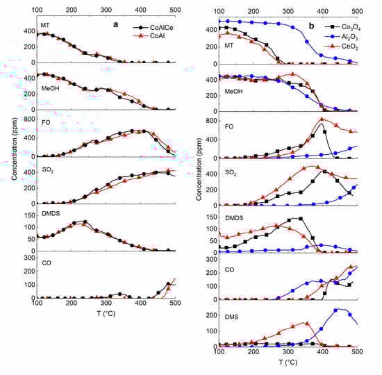 In addition to formaldehyde, the second main product was SO2, which was formed from MT according to Reaction 2. The maximum concentration of SO2 was reached at the lowest temperatures over CeO2 (365 °C) and Co3O4 (395 °C). With the CoAl and CoAlCe catalysts, the maximum SO2 formation was achieved at 500 °C and 445 °C, respectively. With Al2O3, the maximum, stable SO2 formation was achieved at temperatures above 500 °C.