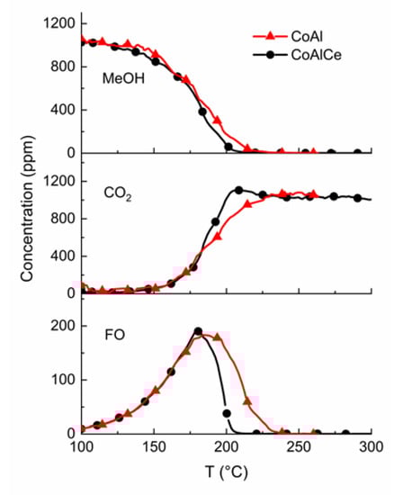 Both CoAl and CoAlCe showed good activity in the total oxidation of methanol at temperatures higher than 230 °C and 205 °C, respectively. Based on the literature, complete oxidation of methanol can be achieved at temperatures between 100 and 200 °C over noble metal catalysts [,,]. Similar results have been observed for 3D ordered mesoporous cubic Co3O4 fabricated with KIT-6 and SBA-16 templating methods []. Formaldehyde was the only noteworthy product apart from the total oxidation products, and its formation stated at a low temperature, reaching the maximum of 300 ppm (185 °C) with the CoAl catalyst and 200 ppm (175 °C) with the CoAlCe catalyst. When temperature was increased further, formaldehyde produced CO2 by the following reaction.