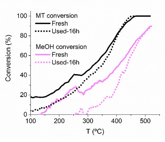 The reactant conversions before (fresh) and after (16 h) the stability test are presented in Figure 10. At the low temperature range, the methanol conversion was significantly lower with the 16 h catalyst than with the fresh one, but the measured maximum conversion was reached at the same temperature. Similarly, the conversion of MT was lower with the 16 h catalyst at a low temperature, but the complete conversion of MT was reached at a somewhat lower temperature (445 °C) with the 16 h catalyst than with the fresh catalyst (460 °C).