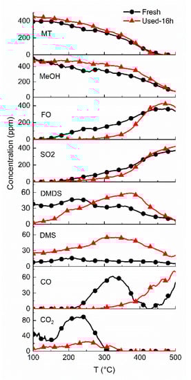 The concentrations of reactants and products before (fresh) and after (16 h) the stability test are presented in Figure 11. Before raising the temperature, reactant concentrations were verified via the by-pass line. There were no significant differences in the initial concentrations of MeOH and MT between the experiments. Therefore, concentrations of the products before and after the stability test can be compared reliably. With the 16 h catalysts, formation of FO and SO2 started at a higher temperature, and the maximum concentrations reached were also slightly higher. DMDS formation with the fresh catalyst started immediately when the gas stream was turned to the reactor at 100 °C. With the 16 h catalyst, the formation of DMDS was slower and the maximum concentration was reached at around 400 °C. The DMS formation with the 16 h catalyst was significantly higher than with the fresh catalyst. When looking the CO formation, we can observe similar phenomenon to the case of CoAlCe powder (Figure 7) for the fresh catalysts. Low temperature CO formation disappeared for the 16 h catalysts. CO2 was formed at low temperatures and stopped above 300 °C. In the case of the fresh catalyst, the CO2 formation was higher. The CO2 formation is potentially due to bentonite used in the pellets, which is able to capture ambient CO2 and release it in the beginning of the experiment. This is also why it was not observed with the 16 h catalyst.