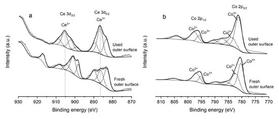 The spectra of the Ce 3d and Co 2p are presented in Figure 12. The deconvolution of Ce 3d spectra revealed two spin-orbit multiples, which correspond to Ce 3d5/2 (883.0–899.3 eV) and Ce 3d3/2 (901.4–916.7 eV) ionizations. For the fresh and 16 h samples, two peaks between 886.3–886.7 eV and 904.3–904.8 eV correspond to Ce3+, which are in good agreement with the literature [,,]. These peaks are labeled in Figure 12. Other peaks are related to Ce4+ [,,]. Co 2p spectra show two spin-orbit multiples, which correspond to Co 2p1/2 and Co 2p3/2 ionizations. The main peaks correspond to either Co2+ or Co3+ species in the mixed oxide or Co3O4. From Figure 12 and Table 8, it can be seen that after the stability test, the amounts of Ce3+ and Co3+ increased. In other words, cerium is reduced and cobalt is oxidized during the stability test. According to Gómez et al. [], these changes in the oxidation states of cerium and cobalt may be related to re-oxidation of the reduced cobalt oxide. The reactions can be written as []: