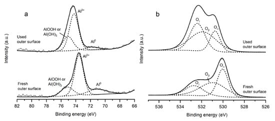 The XPS spectra of Al 2p and O 1s are presented in Figure 13. The deconvolution of the Al 2p spectra revealed three peaks on fresh CoAlCe-P. The main peak at 73.6 eV corresponds to the oxidation state of 3+ in Al2O3 []. For the fresh sample, the peaks at 71.1 and 75.2 eV correspond to metallic Al (Al0) and AlOOH or Al(OH)3, respectively [,]. In the 16 h sample, the amounts of Al3+ and AlOOH or Al(OH)3 slightly increase, while the amount of Al0 decreases.