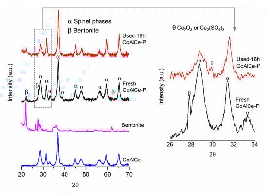 Since cobalt is also toxic [,], our plan was to fix cobalt in a spinel structure. One way to realize this, is to use hydrotalcite-like compounds as precursors of mixed oxides. They have excellent potential for the generation of well dispersed, active and very stable catalysts. This class of layered double hydroxides consists of positively charged metal hydroxide layers separated from each other by anions and water molecules. A wide range of possible cations and anions that could be incorporated into the hydrotalcite (HT) structure gives rise to several modified materials []. Indeed, after calcination treatment, mixed oxides are formed; they have unique properties, such as large surface areas and porosity, good thermal stability, good homogeneity of mixed oxides, unique basic properties and high metal dispersion [,,]. Furthermore, the use of cobalt oxide promoted by cerium oxide can lead to an improvement in the oxygen storage capacity, which evidently enhances the oxidation process. The most important ceria property is the oxygen reservoir corresponding to the storage and the release of oxygen via a redox shift between Ce4+ and Ce3+ [].