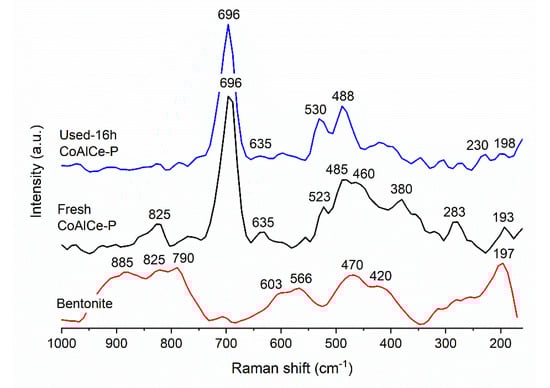 The Raman spectra for cobalt alumina mixed oxides contain several similar bands with Co3O4 [], and for that reason determination of different phases is very challenging. In our case, Raman spectra of the mixed oxides contain almost similar bands with pure Co3O4, but slight broadening of the peaks between 686–456 cm−1 can be observed. In addition to this, bands shift slightly at lower wavenumbers with CoAlCe and slightly higher wavenumbers with CoAl. This may indicate interactions between cobalt, alumina and/or ceria [,,]. On the other hand, in the Raman spectra of the mixed oxides, no clear peaks are observed at 412 and 753 cm−1, which could be an indication that CoAl2O4 is not formed [,]. Based on these results and earlier studies [,], it can be proven that a mixed oxide of Co2AlO4 was formed. In the case of CoAlCe, the peak at 456 cm−1 appears due to the symmetric O–Ce–O stretching mode (F2g) of CeO2 [,]. Shyu et al. [] observed the appearance of peaks at 250, 268, 288, 383, 558, 623, 739, 772 and 840 cm−1 for CeO2/Al2O3. They propose that these additional peaks indicate the presence of Ce interactions with alumina. Similar peaks were observed in our case as well; however, due to the presence of Co species, the indications are not conclusive.