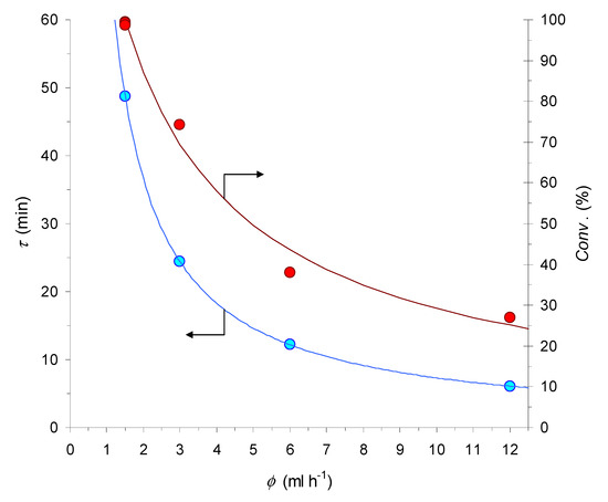 Graphical representation of the relationship between the flow-rate (ф), estimated residence time (τ), and conversion degree (Conv. %) for the benchmark CuAAC reaction in the 10 cm-long MCFR (for the conditions see Table 2, entries 3–7).