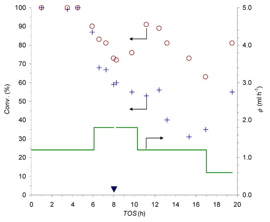 Set flow-rate ф (continuous line) and conversion values at the outlet of PCFRs R1 (circles) and R2 (crosses) as a function of the time on stream; the filled triangle marks a daily break in the experiment’s course (for the conditions, see Table 3, entries 1 and 3).