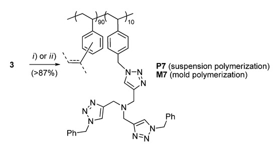 Preparation of the supported TBTA ligands P7 and M7. Conditions: (i) for P7, technical DVB (9 equiv.), AIBN (2 wt %), 1-dodecanol/toluene (1:9 v/v), 0.4% poly(vinyl alcohol) in water, 70 °C, 20 h; (ii) for M7, technical DVB (9 equiv.), AIBN (2 wt %), 1-dodecanol/toluene (2:1 v/v), 70 °C, 24 h.