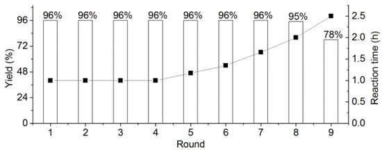 To test the possibility to recycle the catalyst, we loaded the HfCl4 onto a series of activated solid supports (5% w/w). Under the optimized reaction conditions, 10 mol% of the supported HfCl4 was applied as the catalyst. The results listed in Table 3 showed that the catalytic effects of HfCl4/C, HfCl4/Al2O3, and HfCl4/K-10 montmorillonite were similar, where the HfCl4/SiO2-catalyzed reaction required a longer reaction time (2 h). However, these supported catalysts exhibited huge differences upon reuse. Compared with the other three supported catalysts whose potencies remarkably decreased in the 2nd round, HfCl4/C showed consistent catalytic activity in terms of both yield and reaction rate for 4 rounds. As shown in Figure 1, the yields of 3{1,1} with recycled HfCl4/C catalyst could be maintained (over 95%) up to 8 rounds. However, the reaction time was gradually prolonged from 1 to 2 h in the 5th to 8th rounds.