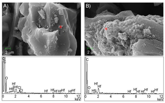 Scanning electron microscope (SEM) images and energy dispersive spectrum (EDS) analysis of HfCl4/C (5% w/w) samples. (A) HfCl4/C and (B) HfCl4/C (reflux/cold filtrate for 5 rounds).