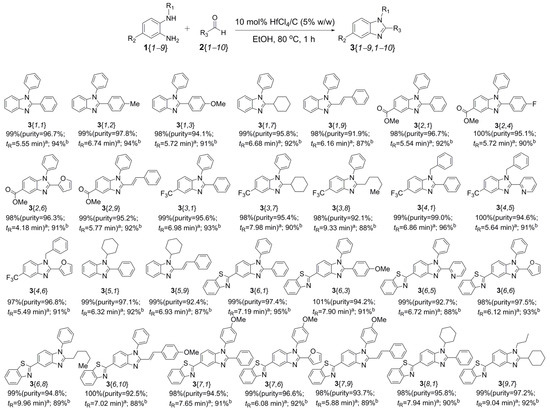HfCl4/C-Catalyzed parallel synthesis of benzimidazoles (3). a The yield of crude 3 (purity and retention time determined by analytical HPLC). b The isolated yield of 3.