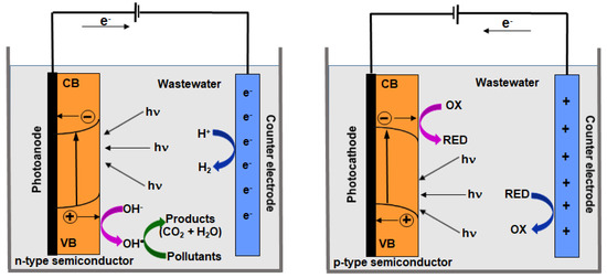 The overall mechanism of photoelectrocatalytic degradation of pollutants in wastewater with the application of n-type and p-type semiconductor electrodes.