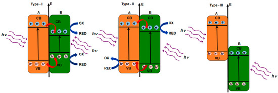 A semiconductor reveals electrical conductivity between a conductor and insulator. Three regions can be distinguished in its electronic energy structure: the valence band (VB), the conduction band (CB), and the band gap. At absolute zero, a semiconductor is an insulator due to the fact that the VB is completely filled with electrons, while the conduction band is completely empty [84]. Under irradiation, if the light energy is higher than the band gap in the semiconductor, then electrons are transferred from VB to CB and e−/h+ pairs are generated. These pairs can recombine with a release of thermal energy or they can be separated and transferred to the semiconductor surface. In the latter case, they take part in oxidation and reduction processes with pollutants being adsorbed at the surface [85]. However, the VB and CB levels should be thermodynamically consistent with the redox potentials of the adsorbates.