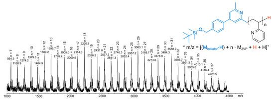 For P2VP, a MALDI-MS spectrum was recorded of purified 2VP oligomers from a reaction of catalyst 4 with 24 equivalents of 2VP in toluene (Figure 5). In this spectrum, a series of signals corresponding to m/z = [(MIni − H) + n × M2VP +H + H]+ with n = 7–37 were observed, representing the 2VP oligomers functionalized with the protected initiator 2. This not only underlines a covalently bonded initiator to the polymer chain, but also further substantiates the assumed initiation mechanism of a nucleophilic attack of the methyl pyridine 2 to the first monomer unit [19,30].