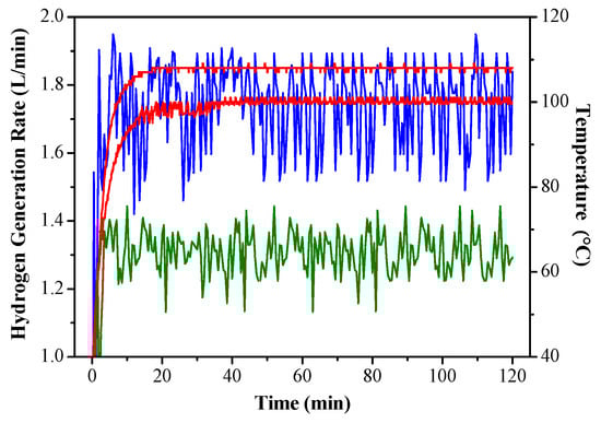 - Under the operating conditions of using five catalysts and a feed rate of 4 g/min, after a long-term hydrogen production test, the overall hydrogen production efficiency was as high as 91.2%, and the reaction temperature was maintained at 108 °C. The average hydrogen-yielding rate was 1.72 L per minute.