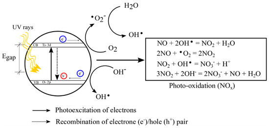 TiO2 is an n-type semiconductor, whose conduction band (CB) and valence band (VB) are at an energy level of −0.03 eV and 2.9 eV, respectively, which results in the band energy gap of 3.2 eV [23,32]. Hence, during the solar irradiation of TiO2, when the energy of the incident photon (Ep) is equivalent to the band energy gap (Egap), it gets absorbed. This phenomenon leads to the formation of hydroxyl (OH•) and superoxide (•O2) radicals by utilising surrounding O2 and H2O, respectively [24]. Finally, the active OH• and •O2 oxidizes the adsorbed NOx into nitrate (NO3-) ions. Figure 1 illustrates a schematic of the whole process [28,33]. The photodegradation of NOx has been exclusively studied while using TiO2 blended cementitious materials in both laboratory and pilot scale setup [34]. Moreover, a number of real life applications of TiO2 blended substrate for atmospheric NOx removal showed convincing results [35,36]. Photocatalytic (TiO2 mixed) pavement blocks are found to effectively remove NOx while using UV irradiance above the light intensity of 1 W/m2, and more than 80% NOx removal was reported at an initial NO concertation of 0.05 ppm to 1.0 ppm [35]. One of the recent studies [37] evaluated the NOx removal of sprayed TiO2 on the retaining wall of an expressway (Gyeongbu, Korea) and it reported a maximum average daily removal of 22%.