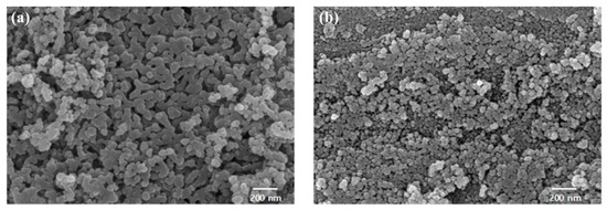 The physicochemical properties of the prepared algae bloomed water treated TiO2 (A-TiO2) NPs were evaluated via scanning electron microscope/energy dispersive X-ray spectroscope, X-ray diffraction (SEM/EDX, XRD), and physisorption of N2. The prevailing physicochemical properties were also compared with annealed algal sludge (A-Residue) from the collected raw lake water sample. Figure 2 shows the SEM image of A-Residue and A-TiO2. The particles that were present in A-TiO2 were well dispersed, and the average particle size was between 20–30 nm (see Figure 2b). On the other hand, particles present in A-Residue were partially agglomerated, and the average particle size was approximately 50 nm. The particles of the prepared A-TiO2 corresponds well with the TiO2 NPs that were prepared by Park et al. [43] and El Saliby et al. [44] through flocculation of dye wastewater and biologically treated sewage effluent, respectively, while using Ti-based coagulant.