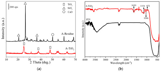 (a) X-ray diffraction (XRD) patterns, (b) Fourier transform infrared (FT-IR) spectra of A-Residue and A-TiO2 prepared from algal turbid water.