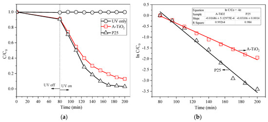 The photocatalytic activities of the developed A-TiO2 NPs were assessed under UV irradiation through the photodegradation of gaseous acetaldehyde (Figure 5) and NOx (Figure 6). Additionally, the degree of photoactivity was compared with commercially available P25. In the case of acetaldehyde decomposition under UV irradiation, to exclude the losses to photodecomposition along with other heterogenous losses, i.e., uptake and hydrolysis, blank experiments were initially performed with 2000 ppmv of acetaldehyde gas mixture in the reactor under UV-A irradiation without any presence of photocatalysts. During UV irradiation for over 200 min., no such observable losses or systemic patterns were observed. Acetaldehyde was adsorbed on A-TiO2 and P25 for 80 min. in dark condition (no UV irradiation) and, at the initiation of UV-A lamp, the concentration of acetaldehyde was found as approximately 1820 ppmv for both A-TiO2 and P25 (see Figure 5). Using Figure 5, under UV irradiation at the end of 200 min. A-TiO2 and P25 removed almost 85.7% and 96.7% of the imparted acetaldehyde gas, respectively. Past studies have shown that the TiO2 photocatalytic degradation rate adopted the traditional pseudo-first-order kinetics pattern of Langmuir–Hinshelwood [52]. The kinetic equation can be expressed as ln C/C0 = −kt. Where, k is the pseudo-first-order reaction rate constant (min−1), C is the concentration at reaction time t, and C0 is the initial concertation. In Figure 5b, the value k was calculated from the slope, where ln C/C0 versus t was plotted. Thus, the reaction rate constant of A-TiO2 and P25 were found as 0.0169 min−1 and 0.0311 min.−1, respectively.