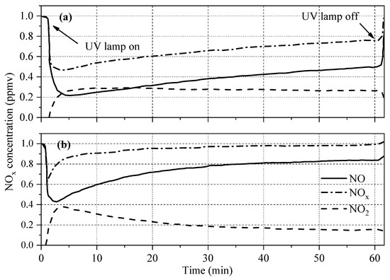 Removal of NOx under UV irradiation over (a) P25 and (b) A-TiO2 NPs.