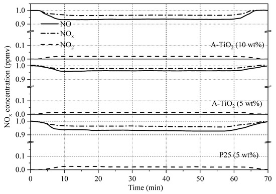 Similarly, following ISO 22197-1, the NOx removal efficiency of A-TiO2 was compared with P25 (Figure 6). At the beginning of UV irradiation, A-TiO2 and P25 both exhibited a rapid reduction of NO, probably due to the combined effect of adsorption and photodegradation [43]. Moreover, the maximum removal of NO achieved under UV irradiation was 57.10% and 78.22% for A-TiO2 and P25, respectively. Apparently, the HNO3 developed during photooxidation of NO might have adsorbed on the surface of TiO2 and diminished the level of photodegradation [30]. Hence, both A-TiO2 and P25 indicated consecutive increase in concentration of NO. After 60 min. of UV irradiation, the NO removal efficiency of A-TiO2 and P25 were determined as 16% and 50%, respectively. In the continuous flow reactor, the average initial concentration of NO was found as 6.95 µmol and 7.01 µmol for A-TiO2 and P25, respectively, as illustrated in Table 3. Under UV irradiation for 60 min., the prepared A-TiO2 removed 1.95 µmol of NO on average, which is approximately 27.99% of the initial concentration. Whereas, the used P25 showed an average removal of 54.17% for the same duration of UV exposure. Meanwhile, under UV light, the average NO2 concentration was increased by 16.50% and 19.79% for A-TiO2 and P25, respectively, which shows a higher selectivity of A-TiO2 towards NO2 production.