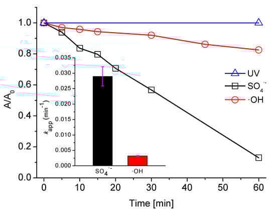 The apparent first order (kapp) rate constants, shown in the inset of Figure 1 and calculated based on Equation (9), are one order of magnitude different higher for SO4•− than for •OH (0.029 min−1 and 0.0032 min−1 for SO4•− and •OH, respectively). Both radicals are susceptible to electron transfer; however, SO4•− shows a much lower energy barrier for this reaction, which results in markedly higher kapp. Therefore, it was decided to focus solely on PDS for a better understanding of its reaction mechanism with the AB129 dye.