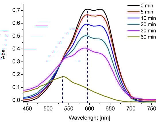At the beginning, a double peak at 595 and 630 nm was recorded. During the experiment, the peak at 630 nm slowly disappeared, followed by the peak at 595 nm. At 20 min, a new peak at 535 nm was formed, which dominated at the end of the experiment (60 min). This peak may represent the formed by-products.