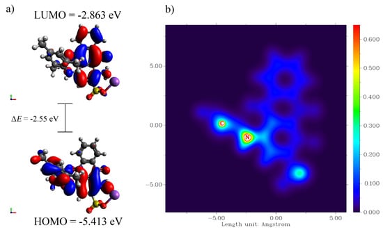 Then the CPCM approach was applied in order to model the solvent (water) effect on the calculated transition energies of the species with the def2-TZVP basis set. The λmax of the visible spectrum was computed to be 594 nm, almost the same as the wavelength, which was used for determination of AB129 (595 nm), and corresponded to the HOMO → LUMO and HOMO-1 → LUMO (overall E = 2.087 eV) transitions of AB129. Moreover, the values of HOMO and LUMO were found to be −5.413 and −2.863 eV, respectively, whereas the difference in the energy (HOMO-LUMO energy gap) was 2.55 eV. Similar values were recently computed and reported for Acid Blue 113 by Asghar et al. []. Figure 6 shows the HOMO and LUMO of AB129 obtained at B3LYP/6-31G** and a map of the electron density of the AB129 molecule.