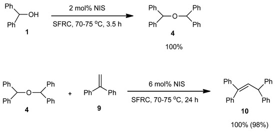 In order to support the assumption that the dimeric ether 4 might be the intermediate of this dehydrative coupling [32], few control reactions were performed (Scheme 1). Under the typical conditions when diphenylmethanol 1 was efficiently and selectively converted into dimeric ether 4, it was applied as a starting material in the reaction with 1,1-diphenylethene 9 providing the corresponding substituted alkene 10 in quantitative yield. With 9 providing the corresponding substituted alkene 10 in quantitative yield.