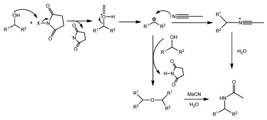 Furthermore, we studied the role of N-halosuccinimides as mediators for direct C-N bond formation in the reaction of the alcohol with acetonitrile and water solution, and results are summarized in Table 3. The transformation of 1-(p-tolyl)ethan-1-ol 14, with acetonitrile 15 in the absence of any of the NXSs, no reaction occurred (entry 1, Table 3), while, in the presence of N-halosuccinimides as the mediator the corresponding N-acyl benzyl product 16 (entries 2–4), in moderate to high yield was observed, accompanied with the formation of a small amount of dimeric ether 17 (entry 4) and oxidized alcohol 18 (entries 2–4, Table 3). We found that NCS and NIS were slightly more convenient mediators for this transformation than NBS. Under the typical reaction conditions in the dark or the presence of radical scavenger, the high conversion of starting material 14 into the corresponding product 16 was established, accompanied by the formation of a small amount of dimeric ether 17 and oxidized alcohol 18 [38] (entries 5–6, Table 3).