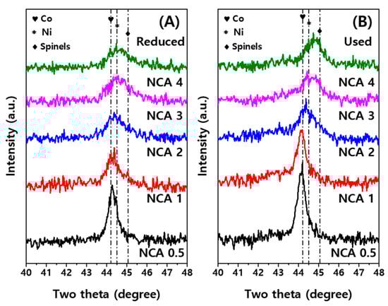 The increased amounts of cobalt metal on the NCA catalysts caused the decreased surface area due to the increased crystallite sizes and small contributions of mesoporous Al2O3, which were calculated by using the main diffraction peaks detected in the range of 44.2° for Co (111)–44.5° for Ni (111) with the help of the Scherrer equation as shown in Figure 1 and Figure S2. The metallic Ni crystallite sizes were found to be 6.5 nm on NCA(4) and 14.6 nm on NCA(0.5), which were decreased with an increase of the Al/Co ratio. It is worth noting that NCA(3) and NCA(4) had the smallest crystallite sizes of 6.3–6.5 nm (dispersion of 3.0–3.6%) among the reduced NCA catalysts. In addition, the characteristic diffraction peaks assigned to the spinel-type NiAl2O4, Co3O4 and CoAl2O4 phases were observed at 31°, 37°, 45°, 56°, 59° and 65°, which are scarcely classified due to their overlapped positions with the same crystal structures of AB2O4 [,,,,,]. Diffraction peaks assigned to the γ-Al2O3 phases were also observed, with their smaller peaks at 38°, 46° and 67°, which also suggests that the Al2O3 seems to exist mainly in the spinel-types such as NiAl2O4 and CoAl2O4 in the NCA catalysts [,]. Interestingly, the peaks of the main diffraction at 44.2°–44.5° were shifted to the higher two theta values and broadened with a decrease of cobalt contents, especially on the NCA(3) and NCA(4), due to the smaller crystallite formations corresponding to larger surface areas. Even though those peaks were hard to be assigned to the different crystalline phases, the transformations of those major crystallite structures were observed from the metallic Co and Ni to the spinel-type NiAl2O4 and CoAl2O4 phases at higher Al/Co ratios on the reduced NCA catalysts (Figure 1A). After the SRP reaction at 650 °C, the used NCA catalysts showed increased metallic crystallite sizes (Figure 1B) due to the aggregations of those nanoparticles with their sizes of 7.3–16.2 nm from 6.3–14.6 nm, as summarized in Table 1. The extents of the aggregations were not significant on the NCA catalysts with a Al/Co ratio ≥2, such as the NCA(3) and NCA(4), while the much bigger crystallites were formed on the used NCA(1) and NCA(0.5) to 12.9 and 16.2 nm in size, respectively. The moderate aggregations of Ni nanoparticles on the NCA(2) (from 6.9 to 8.7 nm with dispersion of 2.5%) were mainly attributed to the formations of strongly interacted Co3O4-Al2O3 particles with a moderate surface area (64 m2/g), which can be more beneficial for increasing the catalytic activity and stability.