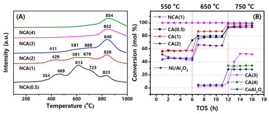 As shown in Figure 2A, the reduction behaviors of the NCA catalysts were measured by temperature programmed reduction (TPR) analysis. With lower contents of cobalt species on the NCA(3) and NCA(4), one reduction peak at the respective temperatures of 842 and 854 °C was clearly observed. In general, cobalt-promoted Ni-based catalysts show the lower temperature shifts of those reduction peaks by facilitating an easy reduction of Ni/Al2O3 [] as observed in Figure 2A from 854 °C on the NCA(4) to 833 °C on the NCA(0.5). In case of the Al/Co ≥ 3, the higher temperature reduction peaks above 800 °C were mainly attributed to the reduction of solid solutions, such as the spinel CoAl2O4 and NiAl2O4 (or strongly interacted NiO species), which were scarcely reduced below 700 °C to metallic Co and Ni due to their stronger metal–support interactions [,,]. With the decreases of Al/Co ratios below two, many additional reduction peaks were observed with broader reduction patterns below 800 °C, which originated from the stepwise reductions of spinel-type oxides [,,,] such as CoAl2O4, Co3O4 and NiAl2O4. In detail, the apparent reduction peaks of cobalt oxides through stepwise reductions (Co3O4 → CoO → Co) were clearly observed below 700 °C, which suggests the preferential segregations of the active cobalt species were on the outer surfaces of the NCA(0.5) and NCA(1) compared to the supports themselves (CA(0.5) and CA(1)) which have lower activity for SRP reactions as well. Interestingly, on the NCA(2), the smaller segregated cobalt species (below ~700 °C) as well as spinel-type metal oxides (at ~839 °C) were observed, which were responsible for an enhanced catalytic activity and stability through the formation of thermally stable mixed metal interfaces.