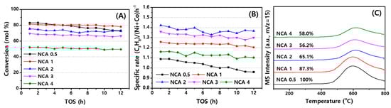 Catalytic activities of the NCA catalysts for (A) C3H8 conversion, (B) specific rate of C3H8 conversion (C3H8 converted/(moles of (Ni + Co)·h)) with time on stream (h) and (C) Temperature programmed surface reaction (TPSR) patterns of the used NCA catalysts at the reaction conditions of T = 650 °C, P = 0.1 MPa and SV = 170,000 L/(kgcat∙h) by using a feed gas composition of C3H8/N2/H2O = 1:4:9.