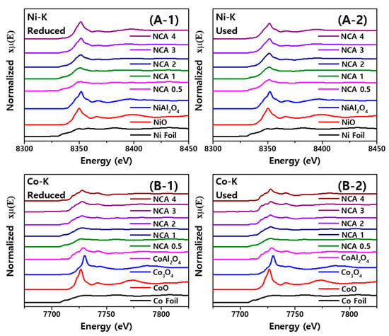 The X-ray absorption fine structure was further carried out to quantify the compositions of crystalline phases with their oxidation states of Ni and Co metals on the reduced and used NCA catalysts by observing the absorption energy of Ni K-edge (8333 eV) and Co K-edge (7709 eV). The spectra of X-ray absorption near-edge structures (XANES) and their phase compositions are summarized in Table 3 and displayed in Figure 4 and Figure 5. The XANES spectra and their first derivatives were fitted to quantify the crystalline phases through linear combination fitting (LCF) by comparing them with various reference samples. With a decrease of the Al/Co ratio, the amounts of metallic Ni were found to be dominant with the ratio of 0.78 and 0.55 on the reduced and used NCA(0.5) with the respective composition of the NiAl2O4 phases of 0.11 and 0.28, since the smaller amount of Al2O3 can suppress the formations of the spinel NiAl2O4 phases with much bigger Ni nanoparticles due to their weak metal–support interaction. With an increase of Al content, the composition of NiAl2O4 phases was significantly increased up to 0.57 and 0.60 on the reduced and used NCA(4). In addition, the observed larger compositions of the NiO and NiAl2O4 phases on the used NCA catalysts compared to that of the reduced ones can be attributed to a high temperature SRP reaction condition with excess oxidative water vapor [].