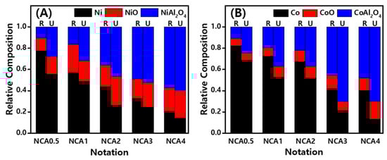 Relative crystalline compositions of the (A) reduced and (B) used NCA catalysts derived from the linear combination fitting (LCF) by comparing them with reference materials.
