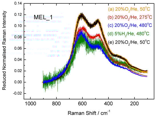 Figure 1 shows the evolution of the in situ reduced (see Section 3.2.3) and normalized Raman spectra obtained for the MEL_1 sample material at different temperatures and gas atmospheres in the sequence: (a) 20% O2/He at 50 °C (the std. dev. of five successive recordings is shown)→(b) 20% O2/He at 275 °C→(c) 20% O2/He at 480 °C→(d) 5% H2/He at 480 °C→(d′) 20% O2/He at 480 °C (spectrum not shown for clarity)→(e) 20% O2/He at 50 °C.