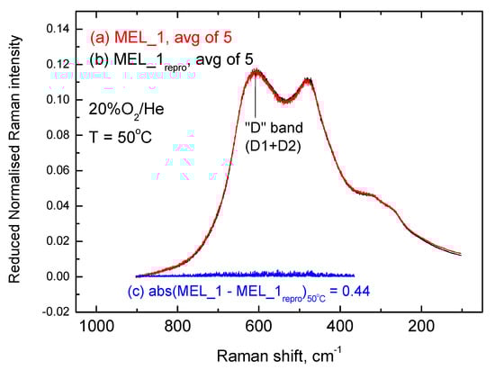 Figure 2 shows the in situ Raman spectra obtained for two specimens of sample MEL_1 under flowing 20% O2/He at 50 °C after exposure at 450 °C for 30 min (see Section 3.2.2). Five recordings were averaged for each specimen (the duration of each recording was ca. 2 h) and the absolute difference of traces (a) and (b) (see Section 3.2.4) is shown with the blue trace in Figure 2c. The integral under trace (c) in the 365–900 cm−1 region had a value of 0.44 in the intrinsic reduced normalized intensity scale (Section 3.2.3):