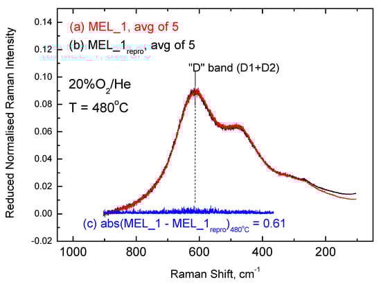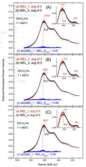 Figure 3 shows the corresponding comparison between the in situ Raman spectra obtained for the two specimens of sample MEL_1 under flowing 20% O2/He at 480 °C. Likewise, five recordings were averaged for each specimen (each recording’s duration was ca. 2 h and 20 min) and the absolute difference of traces (a) and (b) is shown with the blue trace in Figure 3c with the calculated value of 0.61 for the integral under trace (c). Trace (c) (i.e., the absolute difference of (a) and (b)) was, as expected, featureless, as in Figure 2. The standard error of the measurement at the highest peak position (i.e., 612 cm−1) was 0.0900 ± 0.0012.