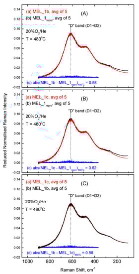 Comparative plots of reduced and normalized in situ Raman spectra obtained under 20% O2/He at 480 °C. (A) MEL_2 vs. MEL_1; (B) MEL_3 vs. MEL_1; (C) MEL_4 vs. MEL_1. Traces (a) pertain to MEL_1; traces (b) pertain to MEL_i (i = 2, 3, 4) as indicated in each panel. Traces (a) and (b) are the averages of five recordings. Τraces (c) with blue color in panels (A–C) show the absolute difference of traces (a) and (b) under comparison in each case and the 0.67, 0.68, and 0.96 values correspond to the integrals under each trace (c). Recording parameters, see Figure 1 caption.