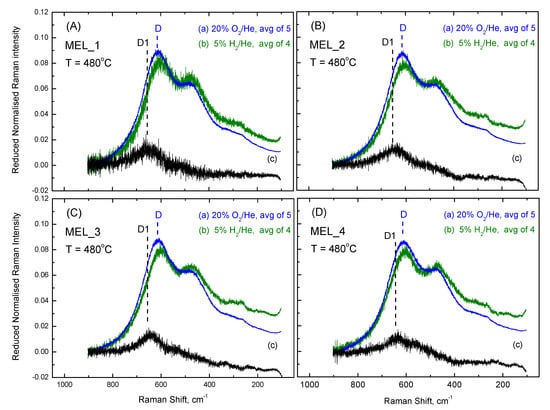 Hence, it turns out that the subtle (but, as shown, experimentally significant) differences observed amongst the studied commercial samples depicted in Figure 5 (and Figure S1) primarily pertain to differences in the respective D bands (at ca. 610 cm−1) (i.e., to variations in the topology involving such O atoms in defect sites and labile O atoms of the material’s lattice). Small variations in the SO42−/Zr4+ ratio in the aqueous chemistry stage of the preparation (see Section 3.1) play a decisive role in the coprecipitation step of cerium–zirconium hydroxides [21], leading to slightly varied defect and vacancy topologies (revealed by the D band) in a manner that in situ Raman spectroscopy is able to capture, in contrast to XRD, which assesses the studied materials as isostructural [14,25,26]. The observed differences in the vacancy and defect topologies is of direct functional relevance, as demonstrated in [20], which was concerned with the differences in transient kinetic rates and characteristics of the 16O/18O exchange via bulk diffusion for the same industrial ceria–zirconia based oxides studied (MEL_1–MEL_4) and the possible origin of the functional (transient kinetic rates) differences from subtle differences in the anionic (oxygen) sub-lattice structure with special emphasis in defects and O vacancies.