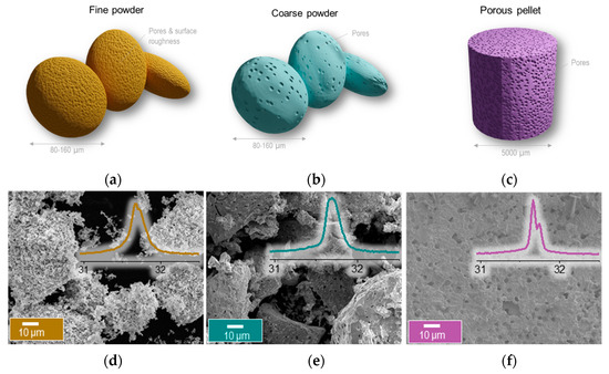 Creating perovskites with different microstructures. (a–c) Illustration of the three different microstructures. Microstructure (SEM) of the La0.8Ce0.1Ni0.4Ti0.6O3 perovskite after micromanipulation to create different microstructures as (d) fine powder (fP) (e) coarse powder (cP) (f) pellet (pP) with inserts of the XRD pattern of the main perovskite peak.