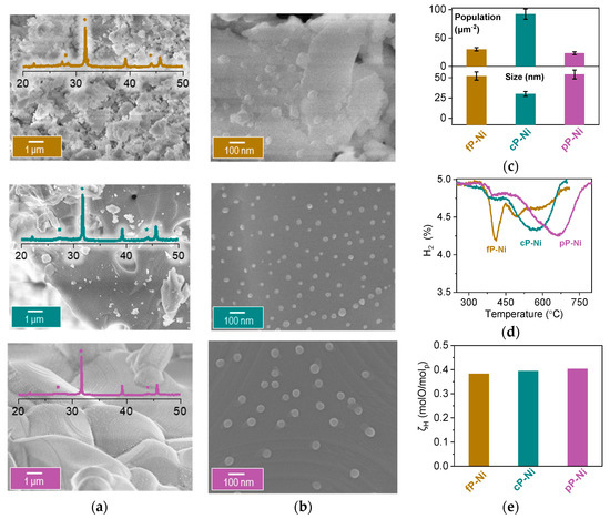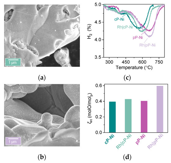 Microstructural analysis using SEM indicates very good dispersion and homogeneous distribution of both metallic Ni and Rh on the surface of the perovskites (Figure 6a,b). Although Rh and Ni particles are seemingly distinguishable due to different size on the surface of the oxide, we cannot exclude the formation of core (Ni)-shell (Rh) particles where a very thin layer of Rh encapsulates Ni particles. In the corresponding HTPR profiles one extra peak for both infiltrated samples can be observed, as compared to the non-impregnated ones, at about 300 °C, which corresponds to the Rh phase that is now present on the surface of these materials (Figure 6c). This is not surprising since Rh particles are smaller than nickel ones, and noble metal oxides are known to reduce much easier than most transition metal oxides, both factors known to result in much lower reduction temperatures. The other reducible phases seem to remain unaltered as far as temperature is concerned, however, it is noticeable that both infiltrated samples display an increase in oxygen capacity as compared to their pristine counterparts (Figure 6d), and this effect is especially pronounced in the Rh|pP-Ni where the oxygen capacity of the material increases by about 30%.