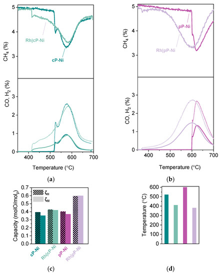In order to probe the effect of the addition of the surface Rh nanoparticles, we carried out MTPR, where it became obvious that the activity of both powder and pellet is increased. In particular, methane conversion increased by about 15% for the Rh|cP-Ni and by 40% for the Rh|pP-Ni. Additionally, 20% and 65% respectively of that achieved methane conversion shifted to lower temperatures. This is in accordance with the literature where Rh addition on the perovskites surface has been shown to increase the concentration of CHx species and thus accelerate the extraction of oxygen, resulting in an enhanced O2− conduction through the bulk of the redox catalyst. It may also be a result of oxygen spillover phenomena where the oxygen extracted from the support can migrate to the noble metal, i.e., Rh [30,31]. However, it is notable that the abovementioned increase in the activity of the materials can be achieved by using such a small amount of noble metals [32]. Both samples are equally selective, reaching almost a 2:1 H2 to CO ratio (Figure 7a,b). What is quite interesting is that if we compare the oxygen capacity calculated using HTPR and MTPR, we notice that the Rh infiltrated samples are able to access all the capacity, as calculated using HTPR experiments, when they are reduced by methane, while for the non-infiltrated samples, there is about 10% of that total capacity that cannot be accessed under testing conditions (Figure 7c). The Rh|pP-Ni here seems to have the most dramatic improvement when infiltrated since the methane activation temperature has been lowered by almost 220 °C, reaching 380 °C, when initially methane got activated at 600 °C (Figure 7b,d).