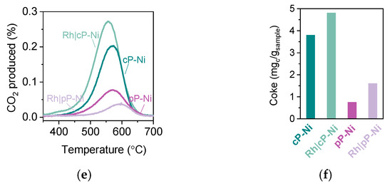 Temperature programmed oxidation after testing (TPO) verifies that the samples display similar stability of carbon on the surface, evident by the gasification temperature (Figure 5c), but the amount is almost negligible for the cP-Ni and the pP-Ni (Figure 5c,d). It is worth noting that even though the fP-Ni seems to have an abundance of carbonaceous deposits on the surface, it still achieves about a two-fold decrease in coking as compared to impregnated samples reported in the literature for these applications [14].