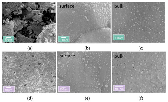 Examination of the microstructure of the materials after the testing and the oxidation experiments reveals that the materials seem to be intact and that there are no cracks on the samples or sintering of the grains of the perovskite (Figure 8a,d). A closer look on the nanostructure, however, indicates that the infiltration had a detrimental effect on the surface of the samples (Figure 8b,e). Some of the exsolved Ni particles seem to have lost their anchorage to the support, while there is some roughness and texture on the surface as compared to the surface of the non-infiltrated samples (Figure 8b,e and Figure 5b). In contrast, the bulk of both materials remains intact (Figure 8c,f) with all particles anchored and with no signs of coalescence.