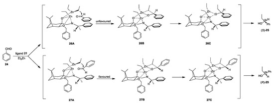 The best (R)-selectivity can be explained with the steric effect of O-benzyl and N-(S)-1-phenylethyl substituent as it is given on Figure 2. The carbon of ethyl group of Et2Zn can attack the carbonyl group from the less hindered Re face resulting in (R)-25 as a main product.