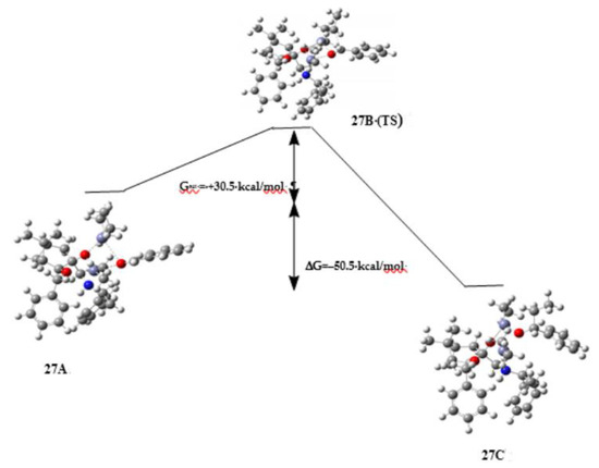 In order to get insight into the mechanism of chiral control over the ethyl-transfer exerted by the pinane ligand, first we carried out modeling studies at the Hartree–Fock level of theory [67] using LANL2DZ basis set [68] on 27A comprising benzaldehyde coordinated to Zn-centers and on 27C with covalently bonded R-carbinol (Figure 3). Both complexes were identified as local minima on the potential energy surface (PES). The transition state of the ethyl transfer 27B was located by QST2 method [69] as a saddle point on the PES. In accord with the general expectations, the ethyl transfer was found to be a highly exothermic step accompanied by a significant decrease in the Gibbs free energy (‒50.5 kcal/mol), but proceeds via a high activation barrier (+30.5 kcal/mol). It is of pronounced significance that the attempts to find a local minimum representing 26A, the benzaldehyde complex preformed for the ethyl-transfer leading to S-adduct have failed so far, as the optimization of all the tentative initial structures led to 27A, the complex mentioned above, that is preformed for the formation of R-carbinol. These findings suggest that the formation of S-carbinol can be ascribed to a competitive process that takes place without the involvement of the pinane ligand affording racemic product, while the investigated ligand seems to promote the exclusive formation of the R-carbinol product.