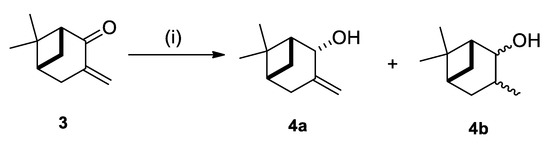 Reduction of 3 with NaBH4 in various solvents gave a mixture of 4a and 4b (Scheme 2, Table 1). It is important to note that whereas allylic alcohol 4a was formed in a highly stereoselective manner, 4b exists as a 4:1 mixture of two cis-diastereomers (diexo and diendo, based on 1H-NMR measurement and comparison with data in the literature) [54,55].