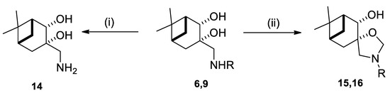 The ring closure reaction of 6 and 9 aminodiols with formaldehyde was also investigated to study the regioselectivity of the reaction [38,42,60]. When these aminodiols were reacted with formaldehyde under mild conditions, spirooxazolidine 15 and 16 were obtained in highly regioselective ring closure, with similar regioselectivity as observed in the case of pinane-based regioisomers [36]. This regioselectivity, however, is opposite to those of the carene-based analogues reported recently (Scheme 4) [37,38].